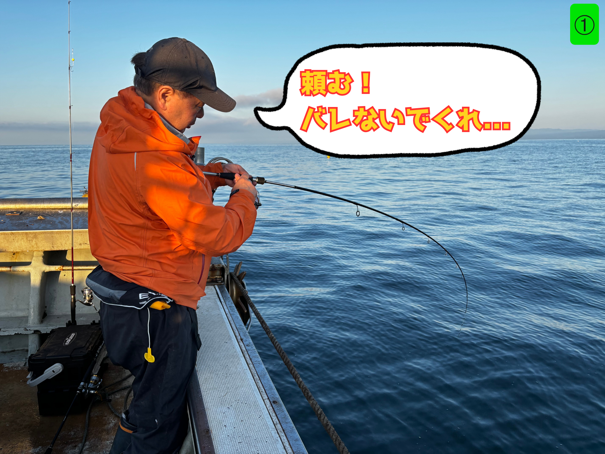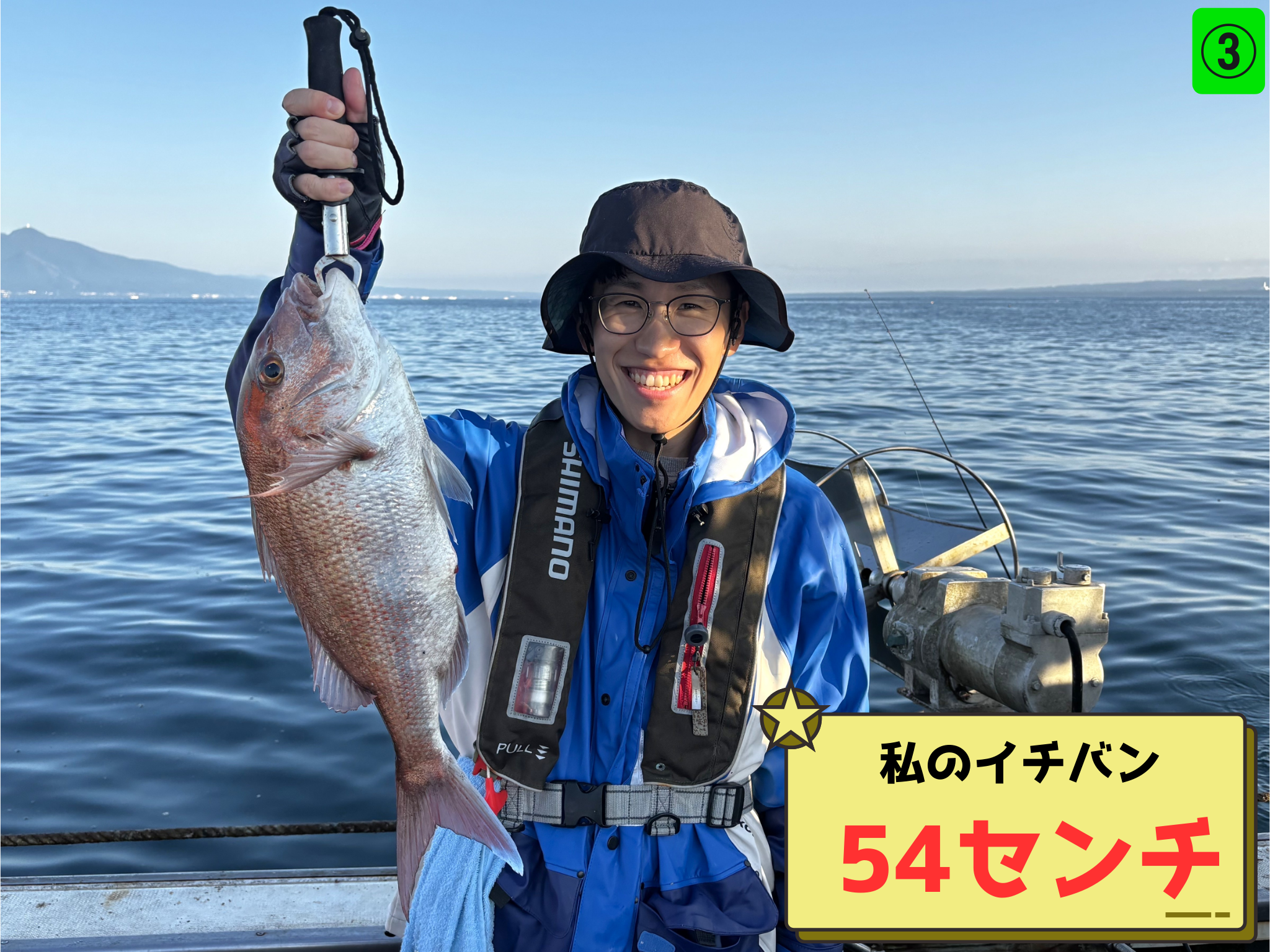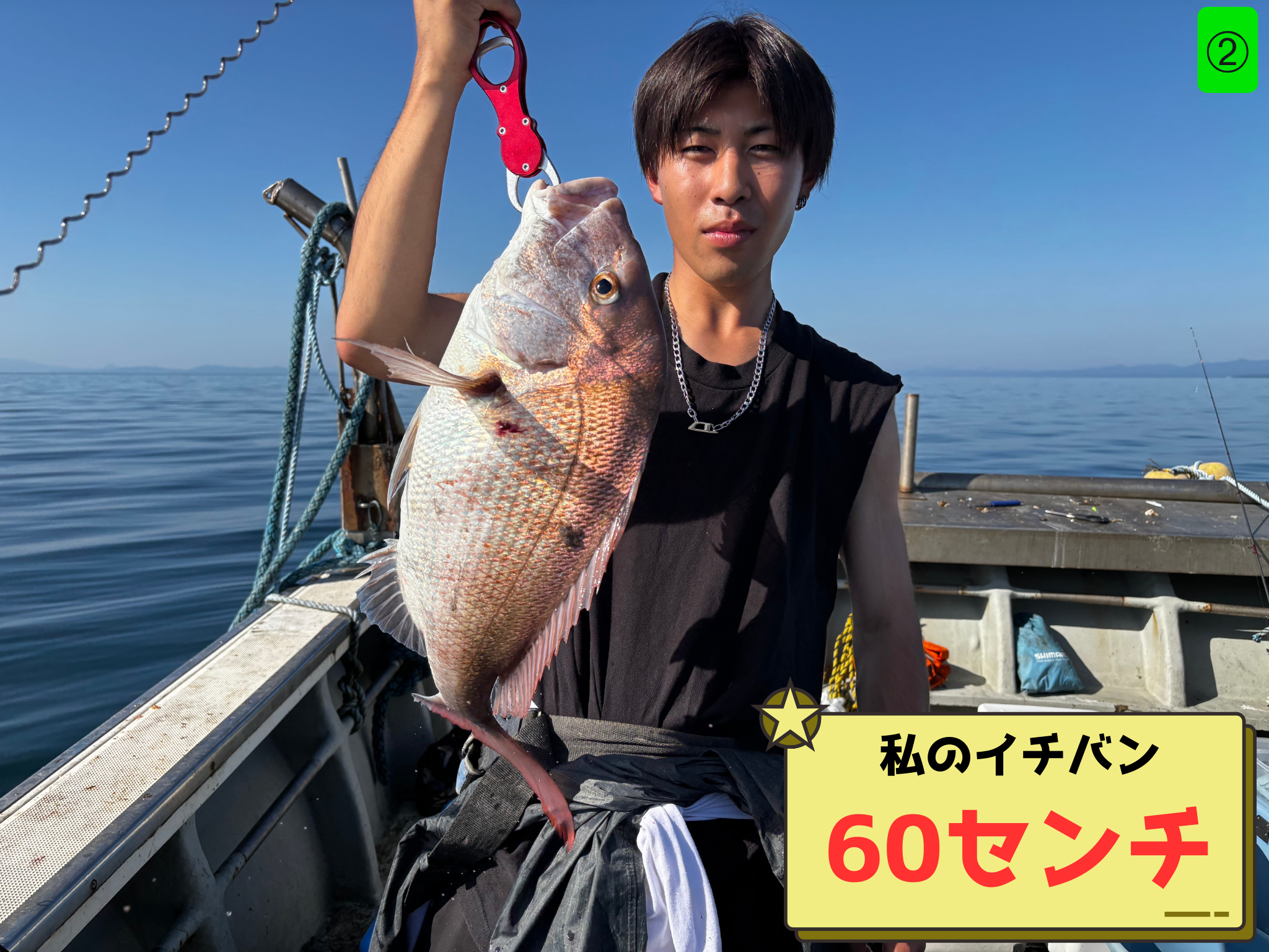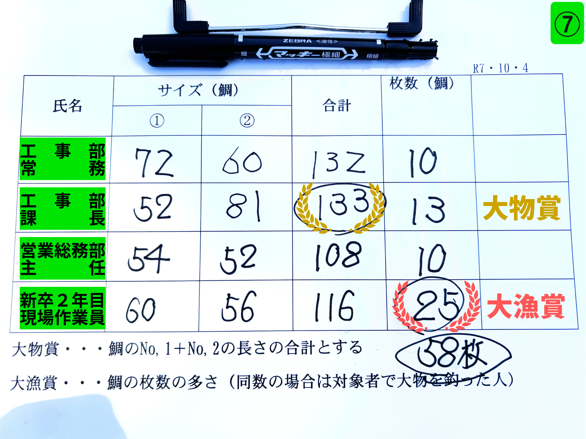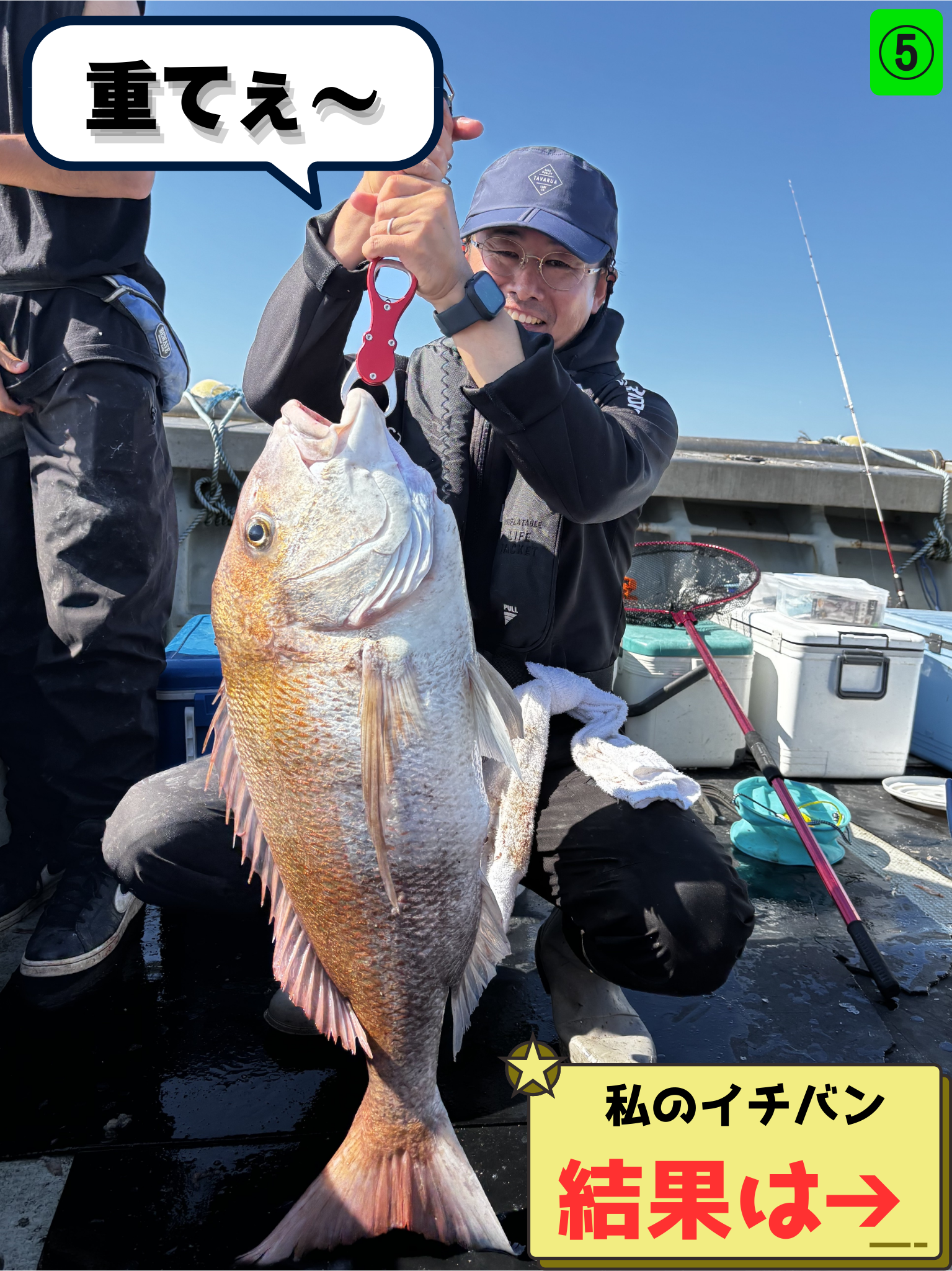 終了1時間前に常務の竿が大きくしなり、釣り上げた鯛 を見て「大物賞は決まったな…」と常務は確信…(写真④)